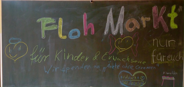 Die 4. Klasse der Friedrich-Fröbel-Schule hat heute einen Spenden-Flohmarkt organisiert, um „Ärzte ohne Grenzen“ zu unterstützen. Dabei sind sagenhafte 191€ zusammengekommen. Die 4. Klasse dankt allen Eltern und Kindern, die ihnen bei der Realisierung des Flohmarktes geholfen haben. Es hat den Kindern eine Menge Spaß gemacht und sie freuen sich, anderen Menschen mit ihrer Aktion geholfen zu haben.