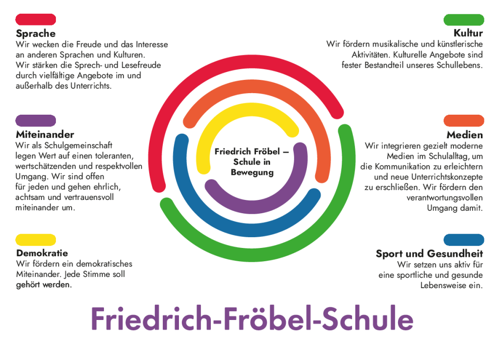 Gemeinsam mit den Eltern und Kindern unserer Schule haben wir in dem Schuljahr 2022/2023 ein neues Leitbild entwickelt. Dabei steht die sportliche Bewegung im Fokus unserer Schule. Dies wird durch die Punkte Sprache, Miteinander, Demokratie, Kultur und Medien ergänzt. Alle Beteiligten der Schule haben sich zum Ziel gesetzt, diese Punkte in ihrer Arbeit umzusetzen.